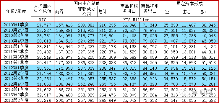 从上图可以看出,虽然以色列经济发展遭遇诸多不利因素干扰,但其国内生产总值和固定资本依然保持稳定增长,商品和服务出口额也维持增长态势。