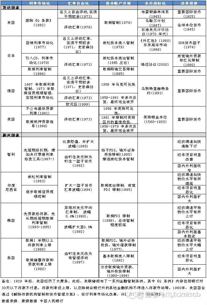 其实对于利率、汇率、资本账户的自由化的先后顺序,各个国家因为政治和经济体系的不同,形成的先后顺序以及遇到的困难也是不一样的。这个方面我们可以参考央行调查统计司的一份课题研究《协调推进利率、汇率改革和资本账户开放》来很好的了解一下,这边我只是提取了此研究课题中的一份各国推进资本账户自由化进程表供大家参考阅读。