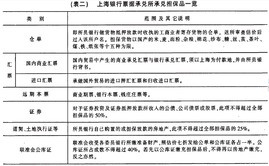 这种“承兑汇票”无论从出票人、承兑人、付款人还是从产生方式来看都与商业汇票有很多不同之处。它是对原有信用工具的创新。并且适合了当时工商业和金融业的实际情形。该所承兑汇票是以所员银行为发票人,以该所审定的货物财产为担保品。所员银行按签订的承兑契约所规定的条件提供担保品清单交由该所审查,该所审查合格并评定价值后,由所员银行将担保品缴人该所保管,这时各所员银行即可填具“承兑汇票申请书”。并开具由该所为付款人的汇票请求该所承兑。@此项“承兑汇票”产生的基础是各所员银行提交的担保品。其涉及的种类很多。列表如下: