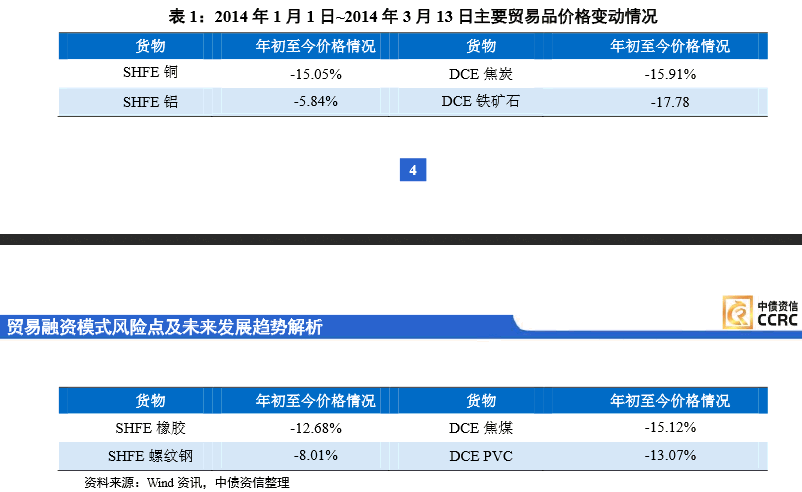 风险点分析——由于利用 信用证从事融资贸易并在短期套现的行为实际是一种短期贷款,而且一般从事该行为的多为轻资产、自身信用品质一般或较差的企业,因此申请信用证的该笔业务所 对应的货权以及货品的变现价值是企业能否偿还到期债务的关键。如图1所示,第一个风险点是货品价值的变动问题,一般企业在申请信用证时多只交付20%左右 的保证金,如果在信用证偿付到期日前铜的价值大幅下跌(如表1所示,今年以来主要工业品及基本金属品价格均大幅下挫),企业未能及时变现,融资贸易的费用 加上货品价格变现的损失可能已超过交付银行的保证金,即使在企业无其他债务的情况下也无法偿还该次信用证到期所需的资金,在近期贸易融资资金链紧张、贸易 品价格大幅下滑的情况下,更易出现贸易商甚至生产企业(已购货品的客户)集中将货品变现的情况,将进一步导致货品价格的下跌。目前从实际操作情况来看,使 用铜作为融资贸易品的比例最大且时间最长,大部分融资贸易企业在进口现货铜 的同时在期货市场卖出,基本能够将产品的变现及价格锁定,风险相对可控。反而存在部分从事真实贸易的进口商没有与下游客户锁定结算价格或在期货市场方向操 作锁定收益,在货品价格大幅下滑的情况下,面临更高的违约风险。第二个风险点是货权的归属问题,如上文所述,如果出现进口商与仓储企业合谋重复开具仓单, 银行的贷款失去了相应的货权,那么该笔信用证预期损失率将大幅增加。第三个风险点是资金的流向及回收问题,进口商在套现之后,倾向于将资金投入到高收益的 领域,例如部分房地产商在境内融资渠道匮乏后,大量从事铜贸易获取融资,将资金用于房地产开发业务,与短债长投账期严重不匹配,一旦房地产销售不畅,易出 现资金链断裂的问题;还有部分资金流入到高风险高收益的领域中,例如企业将资金参与民间借贷,将面临极高的违约风险。再者对于从事真实贸易的企业,在目前 上游生产企业(钢铁、铜加工企业)自身经营困难、资金链紧张的情况下,一旦失去货权而大量应收款难以回收,也将出现资金链断裂的风险。