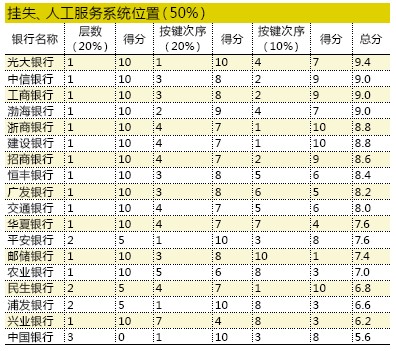 也就是说,在《投资者报》的评分中,以百姓的切身需要为重,对挂失和人工服务的设置给予“半壁江山”的分值。为什么呢?当客户银行卡或存折丢失时,当务之急就是要先挂失,大多数人都会先通过电话进行挂失,如果挂失按键位置靠前,则可以适当减缓客户内心的焦急程度,所以我们认为挂失键越靠前,挂失功能服务得分相应越高。