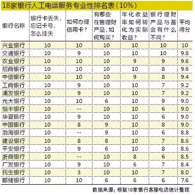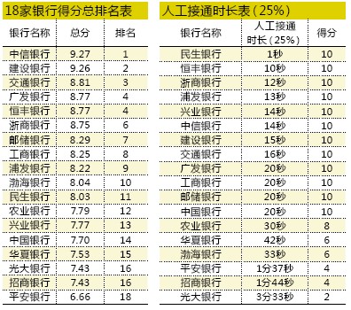18家银行电话客服质量调查:中信建行交行挺进前三甲