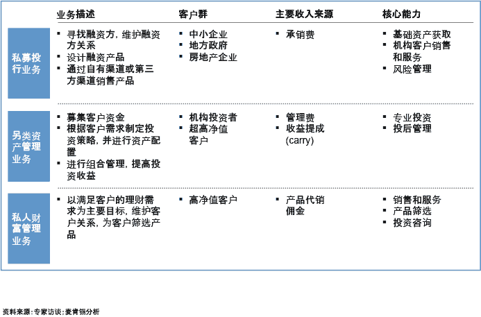 我们认为,中国信托业需要集中关注的未来发展方向有三个:私募投行、另类资产管理和私人财富管理。