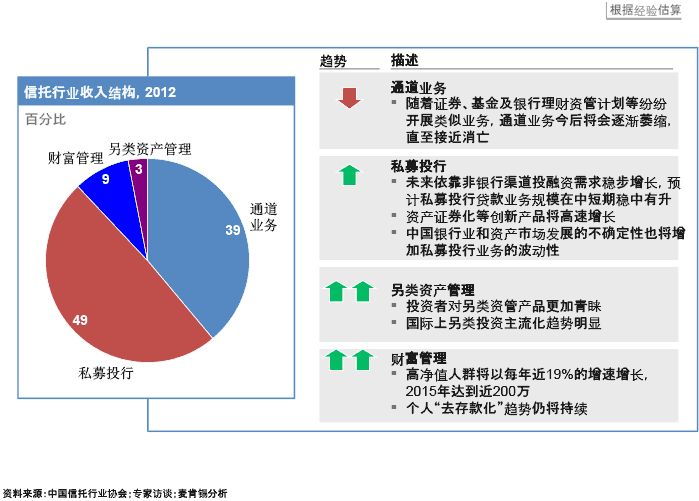 去五年中,中国信托业见证了管理资产规模的高速成长。2007至2012年间,信托业管理资产总规模的年增速高达51%,截至2012年底达到7.5万亿元人民币,从管理资产上超过了保险、基金等金融行业。到2013年三季度末,信托业的管理资产总额超过10万亿元人民币。信托贷款作为企业融资的一个途径,已经成为支撑中国经济发展的重要融资渠道(尤其是在风险较高的行业领域,例如房地产和地方政府融资平台)。信托贷款在社会融资总额中的占比从2007年的3%上升到2013年6月的12%,信托贷款在短短五年中飙升了四倍。然而,中国的信托行业已经走到了一个关键的十字路口,以往赖以生存的盈利模式未来将不可持续。在中国,信托是一类特殊形式的金融机构,发达国家市场并不存在和中国的信托公司直接可比的金融机构。