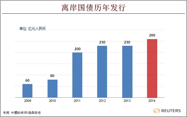 为了加速离岸债券场发展、建置固定收益曲线,中国财政部自2009年起每年均在离岸市场发行国债,目前已发行800亿元,债券余额为645亿元。