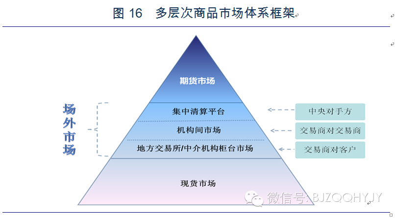 最上层是期货市场;中间层是场外市场,在这一层次中,根据市场组织主体不同,划分为集中清算平台、机构间市场和区域性场外市场/中介机构柜台市场三个子层次;最下层是现货市场。三个市场层次自上至下依据产品标准化程度由高到低排列。
