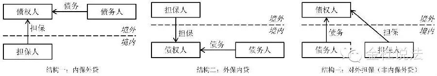 《新规》适用并规范所有形式的跨境担保,并将相应跨境担保结构区分为以下三类:(1) 内保外贷(即担保人注册地在境内、债务人和债权人注册地均在境外的跨境担保,见下图结构一),(2) 外保内贷(即担保人注册地在境外、债务人和债权人注册地均在境内的跨境担保,见下图结构二)和(3)其他形式的跨境担保(如担保人和债务人注册地均在境内、债权人注册地在境外的跨境担保,见下图结构三)。