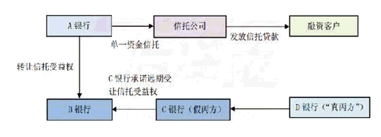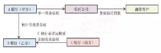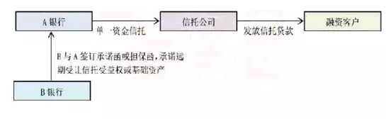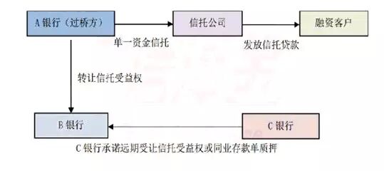 采用这种模式的情形主要有以下两种:一是因为融资客户资质比较差,B银行不愿意直接出资,即不愿意做模式二中的出资乙方,这样B银行就不能与C银行采用标准的三方买入返售模式。这种情形下,C银行就通过B银行以同业存款配资的形式给自己的融资客户放款,这种放款有时是为了解决融资客户贷款逾期后的展期问题。二是因为融资客户资质太好,比如大型国企或央企,这种企业不能承受标准三方模式中较高的资金成本,很多只能承受基准或基准下浮利率的融资成本。而在标准三方模式中,融资客户承受的资金成本基本都高于基准利率,所以C银行一般通过这种模式来打压B银行的收费,达到降低总融资成本的目的。如果融资客户是国企或央企,它可以把B银行收费打压到0.2%-0.5%,这时B银行的收费加上同业存款利率以及信托公司0.1%左右的收费,总融资成本仍能低于基准利率,从而达到给大型国企这类优质客户融资的目的。
