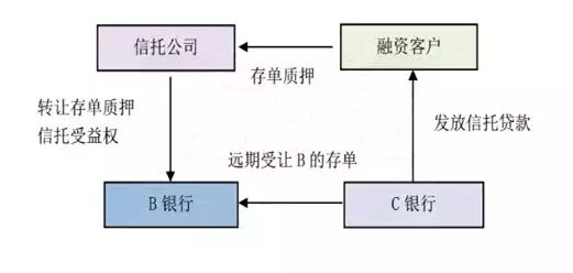 该模式的交易结构:C银行向自己的融资客户放一笔贷款,假设为10个亿,同时C银行要求融资客户将这笔贷款存到自己的银行作存单,此时融资客户无法动用这10个亿的资金。融资客户拿到存单,在信托公司作存单质押贷款,然后B银行实际出资受让这笔存单的信托受益权,并且C银行远期受让由B银行持有的在自己银行的存单。对于B银行,这项业务是低风险业务,因为10亿资金是存的定期,而且存单被质押了。C银行实现了两笔存款和一笔贷款,首先C银行实现了对融资客户的一笔贷款,拿到了贷款利息,融资客户等额将钱存回来又实现了一笔存款。另外融资客户由于存单质押拿到的实际由B银行出资的10个亿,最后也存到了B银行在C银行开设的基本户上。由此,10亿项目,产生了30亿的交易额。如果C银行对融资客户进行一些受托支付的控制,那么融资客户在C银行账户上很能会产生15亿的日均存款量,这15亿的存款按存贷比计算,可以释放的贷款额度超过10个亿,因此C银行给客户放出的10亿贷款,不仅没有占用存量贷款额度,而且还释放出了新的贷款额度。采用这种模式主要是银行为了实现高额存款。释放存贷比,放大交易额。