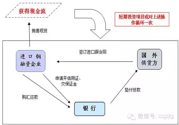 从下图中可以看到,进口融资铜的具体操作思路是:进口融资企业向国外供货商购买货物,签订进口合同,以此向银行申请贸易授信额度,开出长期信用证(一般为美元,需获得银行同意);进口融资企业收到货权单据后,完成进口报关,委托销售商尽快销售该批货物,并收回人民币;进口融资企业以收回的人民币进行短期投资获取高息,并在适当的期限内偿付长期美元信用证占用的信用额度。反复进行上述流程的滚动操作,通过适当调整信用证存续时间和贸易周期,充分提高授信额度的使用效率,持续做大贸易流水,以此不断扩大各方银行对其的贸易授信额度。
