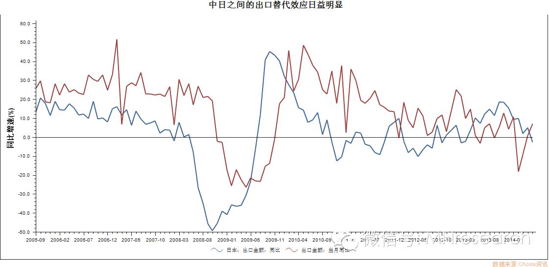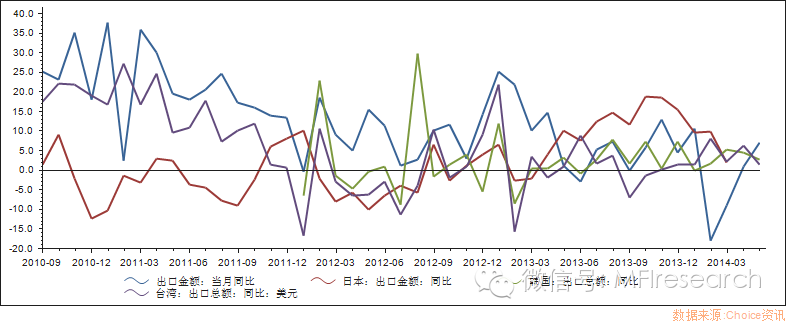 2013年是名副其实的日本年,在日元大幅贬值的支持下,日本出口从2013年3月开始出现远超其他竞争对手的爆发式增长,尤其去年下半年的增速高达14%左右;与之对应,中国出口在2013年3月后大幅下滑。