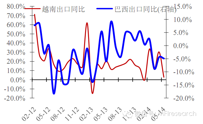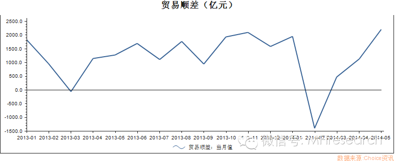 我们从图中看到,从2014年2月的-18%到5月的7%,中国出口部门经历了一个巨大的V型反转。但是其他制造业经济体均处在向下同步衰退的通道中。5月,对主要制造业经济体的来讲,是出口全线衰退,韩国出口同比仅增长2.6%(上月4.3%),台湾1.4%(上月6%),越南几乎0增长,巴西则下降了约5%。德国4月出口重归负增长,为-0.4%,5月数据尚未披露;日本5月则为-2.7%,也重归负增长。这会对安倍经济学再一次提出挑战。
