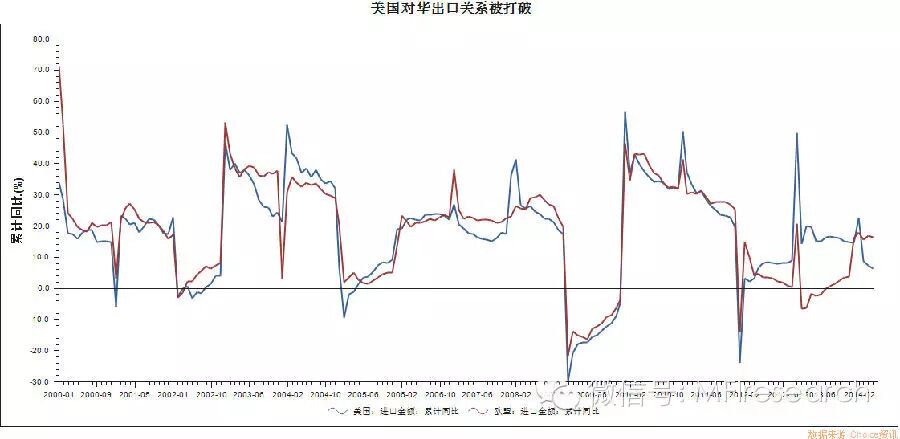 2000年以来,美国对华出口和欧洲对华出口的同比增长走势高度同步。但是2012年5月以来发生了明显的分化。2012年5月-2013年5月,美国对华出口远远高于欧洲对华出口,这一区间正是美国“财政悬崖”危机期,GDP有二次探底的趋势;但是2013年5月至今,中国出于战略考虑将大量高端订单转移至欧洲,相应的,美国对华出口则停滞不前,并在今年一月份反向下滑。这其中可能还包括中国政府加大反腐和打击跨境套利,导致作为洗钱和套利工具的美元商品需求的削减。