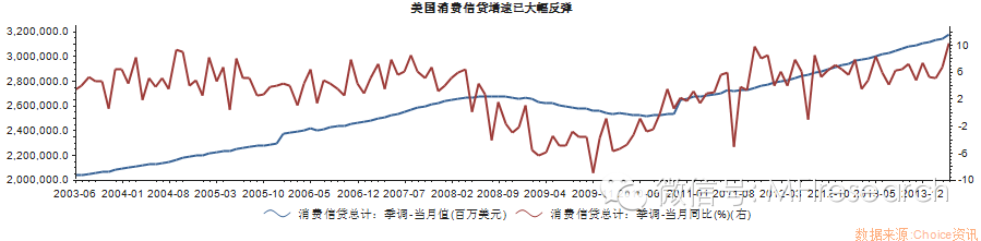 美国的大部分高频领先数据都已超前反应了美国经济扩张的预期。美国私人家庭的资产负债表修复也已经告一段落。消费信贷增速已经大幅反弹至高位,不能奢望再继续大幅上升。