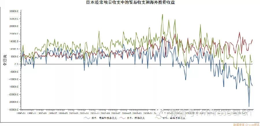 90年代以来,日本的经常账户一直是贸易项目和海外投资收益双顺差,被称为日本的双引擎,相当于为日本老龄化和日本国债系上的双保险。但是我们从下图中看到,其中一个引擎——贸易项目顺差已经于2011年熄灭了。这标志着日本正式进入一个生命周期意义上的晚期国家。可以想象,假如人民币顺利整合东亚地区的制造业集群,则另一个引擎就将熄火,对日本来说将是灭顶之灾。