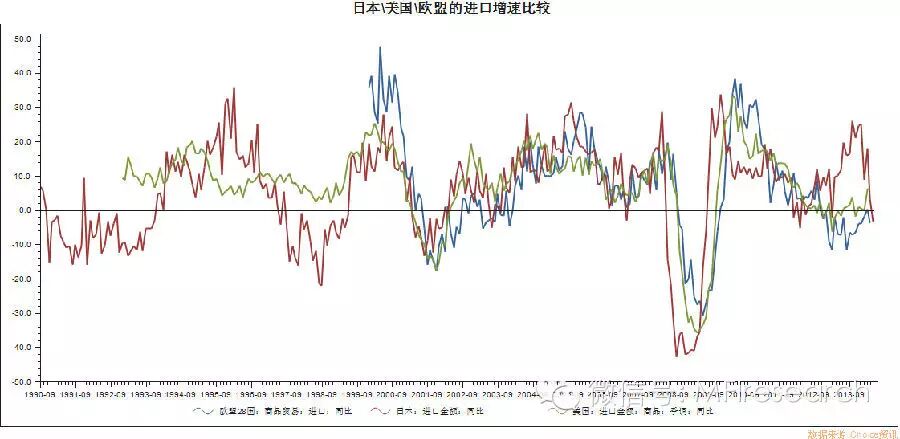 另一组数据也可以说明这一点。下图是美国、日本和欧盟三大主要消费区的进口增速比较。