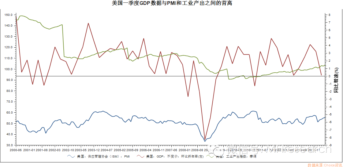 6月26日美国经济分析署公布2014年一季度GDP终值,环比下降达2.9%,如此大幅度的季度下降在美国二战后正常经济年份中是创纪录的。按照这一数据,那么美国毫无疑问是陷入再衰退,一切关于美国的盼望都将是一场空。但是美国的工业产出指数和(ISM)PMI数据均显示美国仍在稳速扩张之中。下图显示了GDP数据与二者之间的严重背离(由于数据软件尚未更新调整后的终值,GDP数据有误,但仍能观察到背离)。