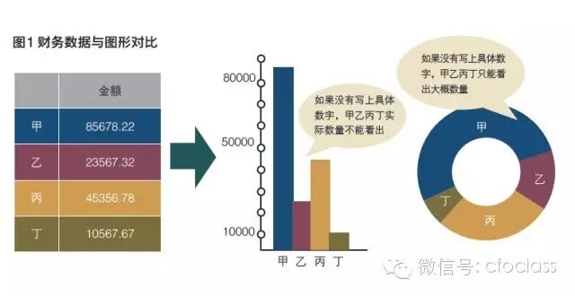 如果从对于数字精确偏爱的角度来说,图形实在不是精确的数字表达方法,从图1中财务数据与图形对比可以看出,柱状图尚能看出大概数字,饼图则只能是比例,根本不能表达数字。图形不写上数据,根本不知道多少,如果写了数字,又何必画图,看数字不行吗?