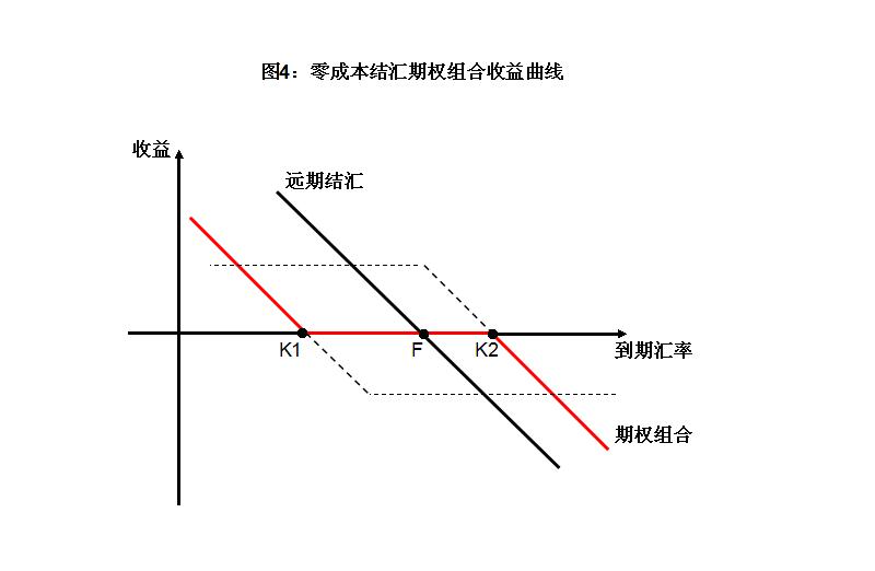 从这个例子可以发现,一方面,人民币外汇期权在双向波动的汇率环境下有很好的应用价值;但另一方面,由于期权费成本的存在,也使规避双向风险的效果打了折扣。买入期权,本质上来说是做多汇率的波动性。由于在人民银行扩大汇率日间波幅后,人民币汇率弹性在提高,汇率波动性在加大,因而期权费自然也会有所上升。为减少期权费成本对避险效果的影响,对于期权费敏感的客户可在买入看跌期权的基础上再办理一笔执行价更高的卖出看涨期权,通过卖出期权获得的期权费收入来部分甚至全部抵消买入期权支付的期权费。这就是自2011年以来各家银行力推的人民币外汇期权组合业务。我们仍旧以收益曲线(见图4)来看一下期权组合的效果,为方便起见,我们选择零成本结汇期权组合来做分析。