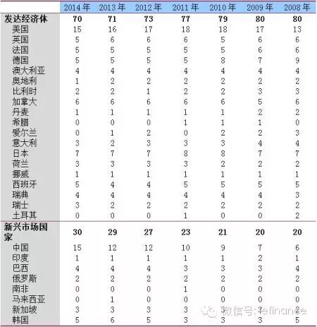 第一,“西退东进”更细节地表现为“欧退中进”,2008-2014年,来自中国的百强银行从6家增至15家,剩下的新兴市场国家里,只有新加坡的百强银行增加了1家;2008-2014年,美国上榜银行不仅没有减少,还从13家增至15家,而来自德国、爱尔兰和土耳其的百强银行分别减少了4、3和2家,来自英国、法国、奥地利、比利时、丹麦和意大利的百强银行则都减少了一家,这与美国领跑发达国家、中国支撑新兴市场的宏观格局相仿。