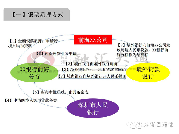 企业提供其收到的银行承兑汇票质押给银行,银行授予其不高于银行承兑汇票有效评估价值的授信额度用于跨境人民币贷款。(按照现有银承贴现利率7%左右,按照跨境贷综合成本5-5.5%左右,直接降低企业成本1.5-2%)