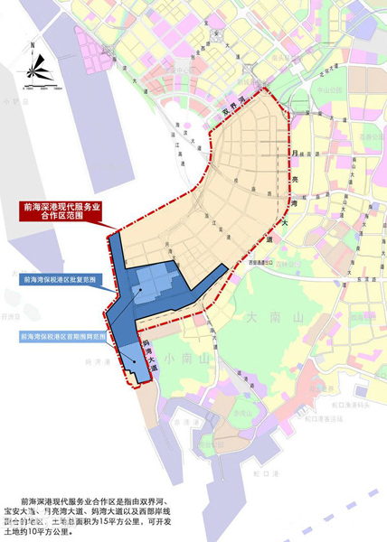 前海位于深圳南山区,由双界河、月亮湾大道、妈湾大道、宝安大道和西部岸线合围而成(以月亮湾大道为界,以西的区域),占地面积约15平方公里,依托深港经济圈,前海经济中心要打造成珠三角的“曼哈顿”。