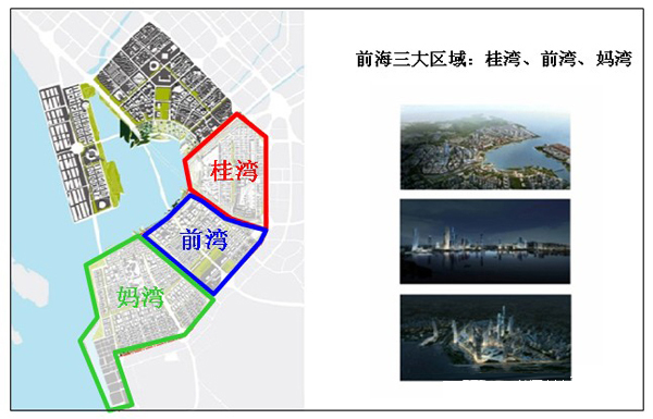 “三区”是指桂湾片区、前湾片区和妈湾片区,三个片区的产业发展各有侧重,其中桂湾片区将安排一组标志性的超高层建筑簇群,统领整个前海湾区,并成为景观视线焦点,打造深圳滨海城市中心的新地标。