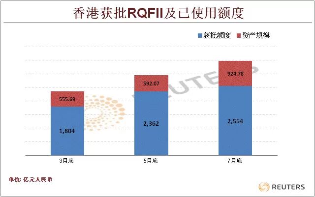 据路透不完全统计, 截至5月25日,所有RQFII产品的资产规模为592.07亿元,额度使用率只有29.52%。截至7月底,RQFII额度整体使用率35.9%,较5月底的29.52%有一定升幅,其中公募产品获批额度为1591亿元,使用率50.21%,其他产品获批额度为1005亿元,仅使用了136亿元,使用率不足14%。