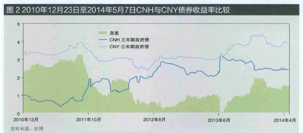 对于内地和离岸投资者,激励因素是不同的。内地投资者能够按面值交易CNH与CNY,因此,利率较低时,他们更愿意借入款项;利率较高时,他们更愿意向外发放贷款。CNH的债券收益率通常较低,因此内地投资者更愿意借入CNH并借出(或投资)CNY(见图2)。然而,投资者在这些利率之间的套利行为是受到中国政府严格限制的。这些利率之间的巨大偏差是长期存在的,显示了官方限制所发挥的约束作用。