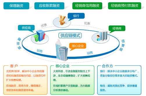 供应链金融是银行围绕核心企业,管理上下游中小企业的资金流和物流,并把握单个企业的不可控风险为供应链企业整体的可控风险,立体获取各类信息,将风险控制在最低的金融服务。