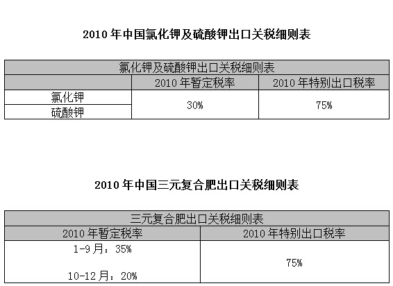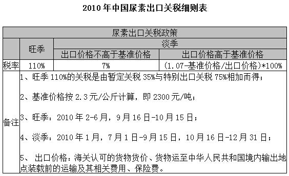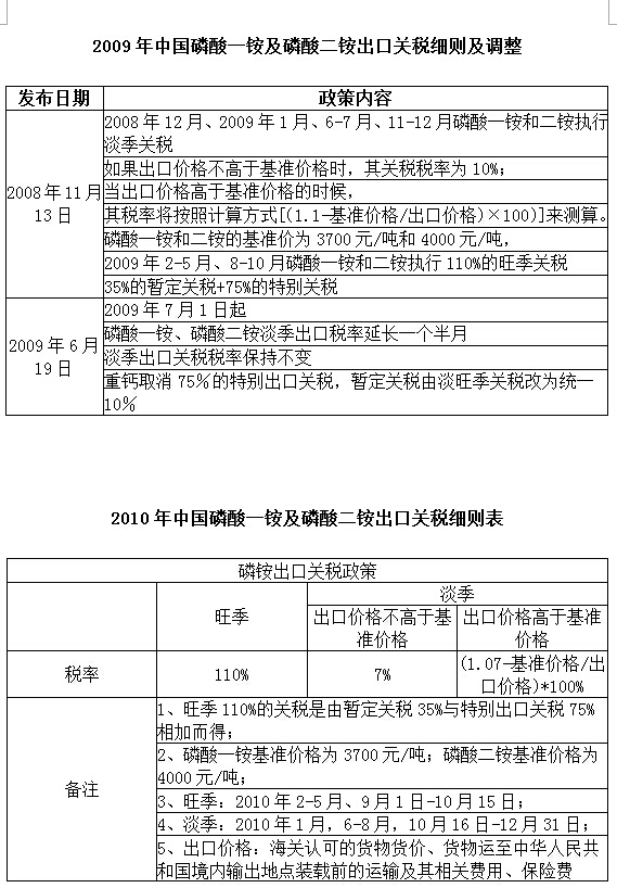 2008年11月14日,对出口化肥制定了最新的出口政策。主要内容是:经过调整的税率为:旺季尿素、磷酸二铵、磷酸一铵、重钙的出口关税均为110%;对淡季出口化肥设定基准价格,淡季出口关税由125%~185%降低为10%~110%。方案执行日期由2008年12月1日至2009年月12月31 日,规定尿素旺季为2009年2~6月、9月1日~11月15日,淡季为2008年12月、2009年1月、2009年7~8月、2009年11月16日~12月31日;重过磷酸钙旺季为2009年2~5月,淡季为2008年12月、2009年1月、2009年6~12月;磷酸一铵、磷酸二铵旺季为 2009年2~5月、8~10月,淡季为2008年12月、2009年1月、2009年6~7月、2009年11~12月。尿素、磷酸一铵、磷酸二铵、重过磷酸钙淡季出口税率的计算公式为:(1.1-产品基准价格/产品出口价格)×100%,基准价格分别为:2300元/吨、3700元/吨、4000元/ 吨和3100元/吨。