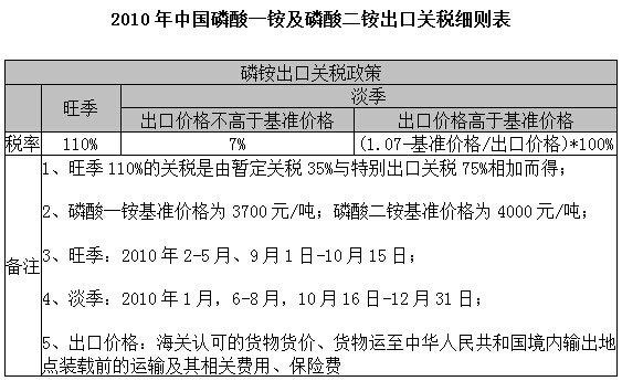 2010年磷酸二铵出口税率,旺季(2-5月, 9月1日-10月15日)是暂定税率35%和特别出口税率75%之和。淡季(1月,6-8月,10月16日-12月31日)是:当出口价格不高于基准价格时,7%;当出口价格高于基准价格时,税率=(1.07-基准价格/出口价格)*100%(基准价格按4.0元/公斤计算)。
