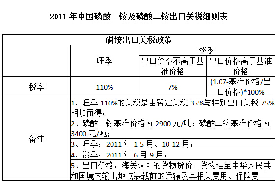 自2010年12月1日至12月31起,磷铵执行110%(由暂定关税35%与特别出口关税75%相加而得)的旺季关税,12月1日前提前申报出口并在3个工作日内运抵海关监管区的,允许按原税率执行。其中磷酸一铵基准价格为2900元/吨;磷酸二铵基准价格为3400元/吨。