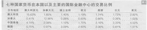 还值得注意的是,加拿大元在美国的交易比重(34.44%)几乎是其他国际货币在美国的交易比重的两倍。这不仅与美加两国在地理位置上毗邻有关,也与美加两国在经济上密切的合作有着极大的关系。