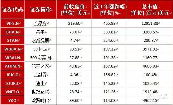 此外,随着中国企业在美上市热潮涌起,中国投资者对于美股的艳羡越来越高。今年以来,美股市场持续升温,尤其是中概股互联网板块,受到众多投资者的青睐,多家中国互联网企业自上市以来均取得亮眼,甚至翻倍的涨幅。目前,排名前十的互联网企业最近一年内的涨幅已经超过100%,其中,唯品会涨幅最高,达465.88%。