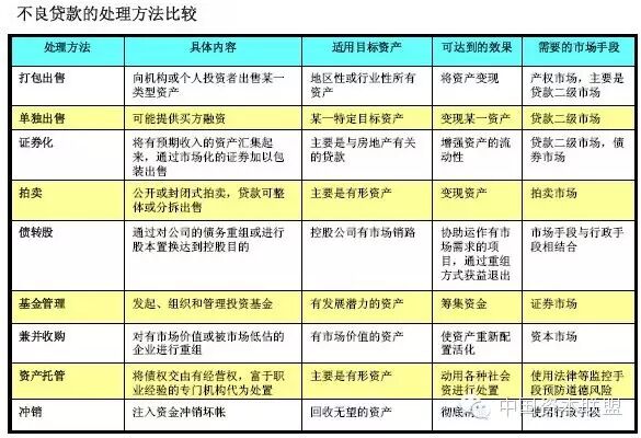 1、出售:包括打包在一起出售,单独出售,拍卖出售等等。比较特殊的是证券化,比较类似于把不良资产看成一个上市公司然后发行股票,当然实际发行的不是股票,而是另外一种证券,这是把不好卖的不良资产变成比较好卖的可流通证券,然后出售。