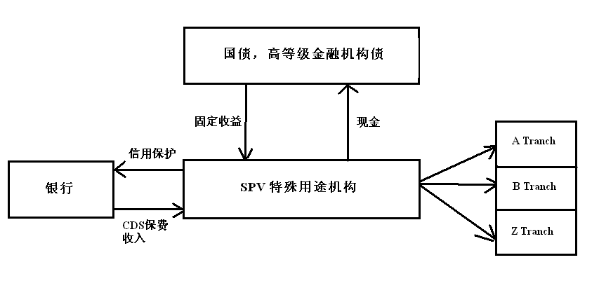 类似的例子还有“合成”CDO。一支真正的CDO必须有先有产生现金流的基础资产,随后为了重新赋予这些基础资产以流动性,将获得现金流的权利重新打包出售。这样的基础资产可以是许多笔银行贷款,可以是债券,可以是信用卡还款等。那么,如果没有这样的基础资产,是否还能够打造一支CDO产品呢?在金融工程的“创造性”解决方案下,动动脑子就有可能。简单举例来说,合成CDO的发行方所组建的“特殊用途机构”需要进行信用保护的金融机构(如银行)卖出CDS(可以视为是对违约风险的保险),从而获得保费收入,再将所获保费收入用以购买高级别抵押资产,如国债,金融机构债券等,最后将债券的本金和利息收入进行结构化处理后出售给有相应投资需求的投资者。