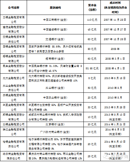 截止目前,我国开业和已批复未开业的金融租赁公司一共26家,其中银行系金融租赁公司16家,非银行系金融租赁公司10家,具体明细见下表: