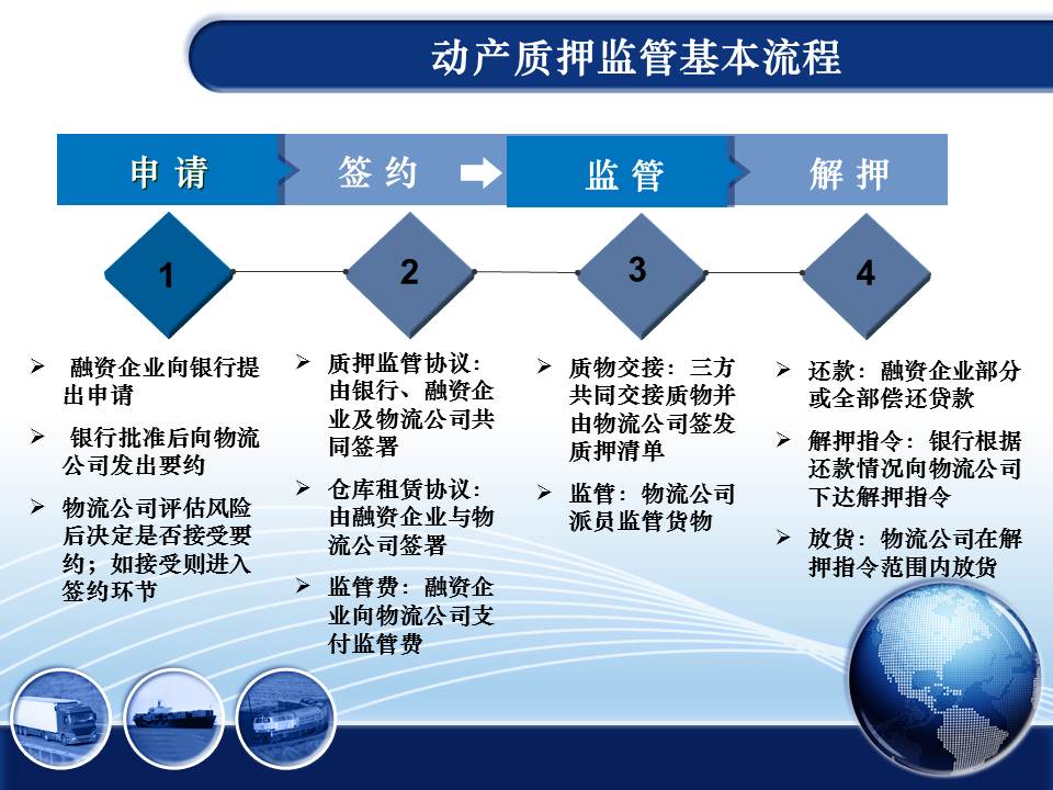 动产质押监管,是指银行向企业提供金融服务(包括授信融资、保兑、保理、信用证等)并以企业自有或银行认可的第三人的动产作为质押担保,为了保持动产的担保属性,物流公司在仓储环节实行监管的物流衍生业务。