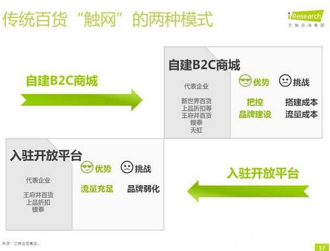 下面我们来看下中国传统百货O2O市场的渠道布局的情况,总结传统百货要发展线上的话可以总结为两个方面,第一个就是入驻线上平台,第二个方面就是自建B2C商城,对于入驻线上平台来讲,这种方法的优势就是流量充足,比方说天猫、京东这些大企业都是不缺流量的,劣势就是百货企业对这些平台的依附性会增强,还会有品牌弱化的风险。对于自建B2C商城来说,这个优势是企业对网站的把控能力比较强,有利于自身品牌文化建设,但是挑战也是不容小觑的,主要是初期的投入特别高,不管是人力还是物力。