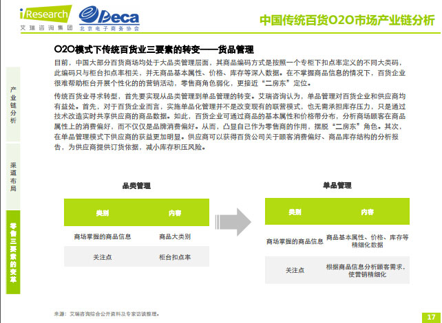在O2O模式下,传统百货转变最大的我觉得应该是货品管理这一方向,之前传统商场对于商品的管理只是基于大品类层面的管理,这个品类的编码可能只关系到这个柜台或者这家品牌的销售情况,因为会跟他们家的扣点或者佣金挂钩。但是如果在O2O模式下的百货商场还是要掌握到商品的一些基本属性信息的,比方说价格库存量或者是SKU这些颗粒度非常小的信息。这些信息关注点就不只是说这个柜台卖了多少货,而是根据卖出的货品和会员的情况做一个深入的匹配来分析会员的需求。