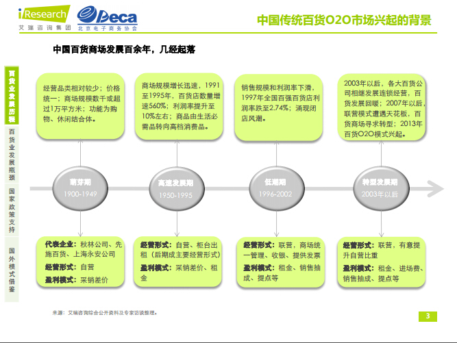 首先来看第一张图,想讲一下近现代以来中国传统百货业的发展情况,从1900年到1949年可以看出中国传统百货业经历了一个萌芽期,这个时间的一个主要特点是百货商场的经营品类是相对较少的,而且价格非常统一,营业面积在数千平米左右,最大的到一万平米多一点,百货的功能是购物和休闲的一种结合体,代表企业是秋林公司和先施百货,当时的传统百货全部是自营模式,盈利模式是产销差价,从1950年到1995年传统百货经历了一个高速发展期,这个时期的特点是,传统百货的营业规模和销售额都是双倍增长的。