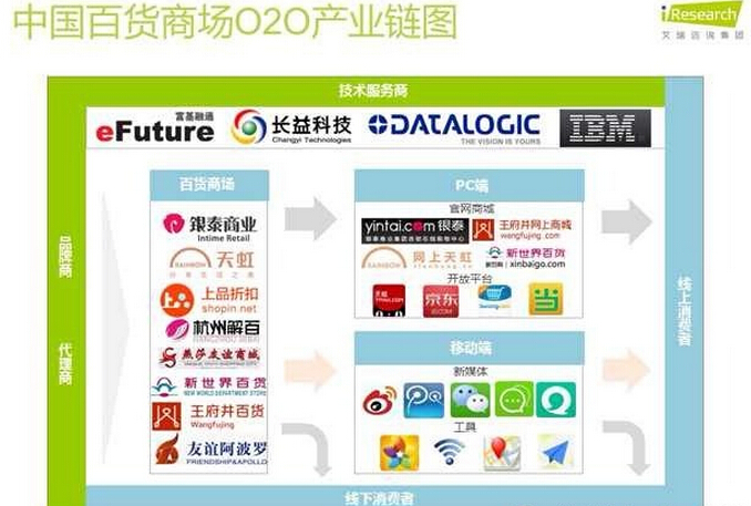 最后一点就是银泰跟天猫携手,在2013年双十一的时候,营业额达到了3700万左右,让人觉得传统百货O2O也不是无迹可寻的。在O2O模式下,传统百货的卖场也获得了一定程度的延伸,之前的百货卖场只是一个线下的门店,顾客到了那里选购商品然后在柜台结算,可能就只能用现金、pos机和预付卡来结算,但是现在新媒体和新技术的影响下,传统百货的卖场可以延伸到线上商城、APP和微信端,加上自身的门店,可以形成一个三方向的卖场,而且在支付环节也可以给会员提供多元化的不仅是柜台结算单一功能,还会有财付通支付宝这些支付手段,会给顾客提供更多元化的服务。