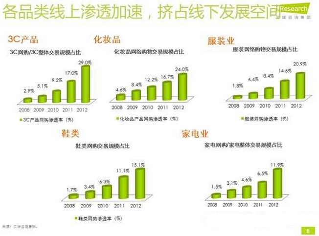 接下来谈一下传统百货近两年来具体的一个发展情况,从第一个图中我们可以看到从2011年到2012年,传统百货的门店数量下滑了9.3%,营业面积下滑了1.5%。但在传统百货走下坡路的同时,中国网络购物的发展却是风生水起,从第二张图我们可以看到3c,化妆品,服装,这五个品类网购渗透率的情况,我们都知道化妆品、服装、鞋类是传统百货主要的销售品类,可以看到2012年的时候化妆品的线上渗透率已经达到了24%服装事21%左右鞋类也已经到了15%。所以从这些数据看出,网上购物对线下门店的冲击也是比较严重地。