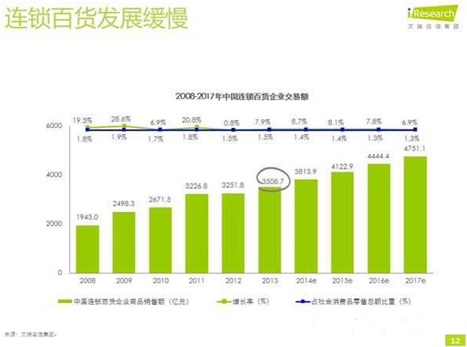 接下来讲的是中国连锁百货的发展现状,第一张图展示的是连锁百货的交易额水平,从图中我们可以到从08年到13年中国传统连锁百货发展的特点就是体量小、增速慢,而且所占的比重也是比较平稳的,到2013年左右连锁百货的总销售是3508亿左右,增长率是7.9%占首领的比重只有1.5%。