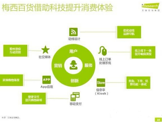 举一个梅西百货的例子,梅西百货近两年在他的门店做了很多的转型工作,比方说在门店铺设了免费Wifi,然后可以根据消费者使用WiFi的功能的同时来定位他的动线。然后从新设计动线,还可以随时推送商品的促销信息和商场的其他相关信息,第二个是在门店内上线订单处理系统,这样的话,消费者可以同时选择是在门店还是在线上购买商品。第三个就是在门店内设置一个信息亭,这个信息亭是集查询、下单、结算于一体的终端机,消费者可以查找自己想要的商品。