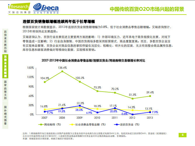 虽然国内传统百货的发展是这样一种情况,但是对比国外来看,尤其是美国,他们的网络零售还是由传统企业来推动的,可以从第一张表中看到,美国的纯电商企业只有4家是在Top20中的,剩下的16家企业,他们的线上销售额占比都非常大,比方说我们熟知的苹果、Stoples,还有梅西百货,尤其是Stoples,他的网络销售额已经占到了自身营业额的42%,所以可以看出来美国的网络零售业是靠传统零售业来推动的,这给我们国家的传统零售业也带来了很多借鉴意义。