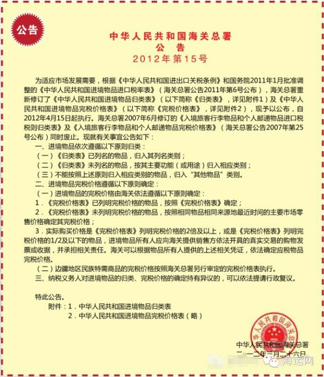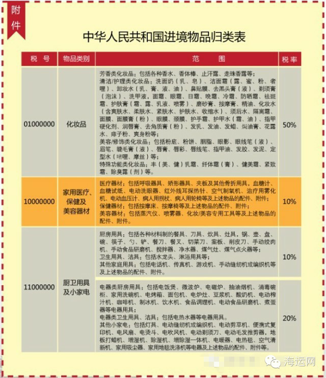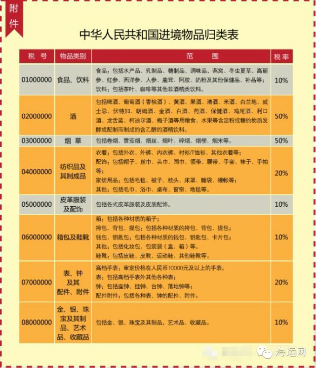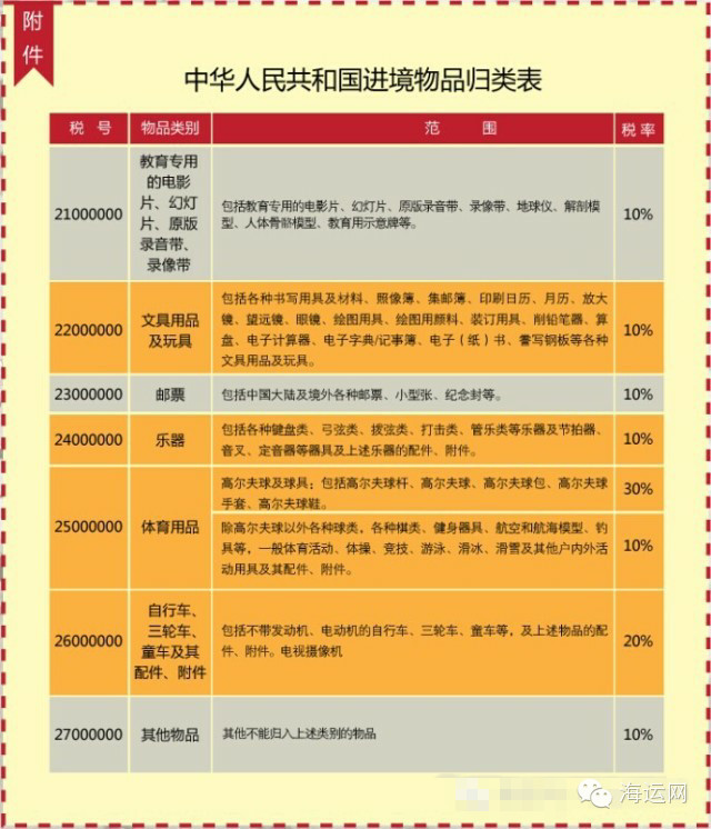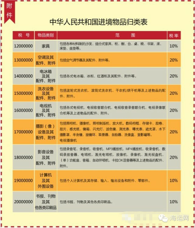 您知道吗?对于进境物品需要征税的情况,不同物品的税率是不一样的,总体来说,划分成4个档次,分别是:10%、20%、30%、50%,这些在海关总署2012年第15号公告里都有列明。今天,我们带您一起来看看进境物品归类表的具体内容: