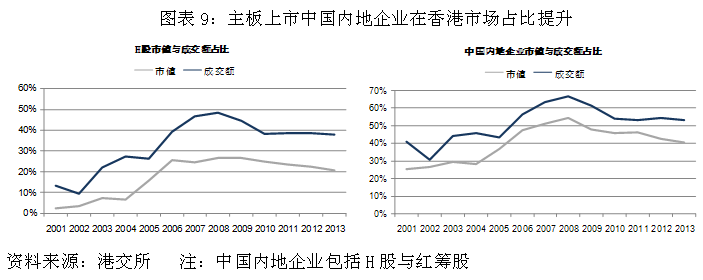 从长周期数据来看,香港与国内股票市场的相关性一直较高。2008年经济危机前后各五年的数据显示,两地市场的相关性均高于0.5,显示出较强的相关性(图表7)。这主要是因为自2000年以来中国内地企业在香港市场所占比重越来越大,2013年香港主板市场中国内地企业市值占比超过40%,成交额占比超过50%(图表9);以及2007年“港股直通车”呼之欲出提升了大陆投资者对港股的热情,中国大陆投资者在香港市场占比持续提升。2012/13年中国大陆投资者交易额占所有香港市场海外投资者交易额的11%,较05/06年水平翻了一番(图表10)。从“沪港通”公布前后三个月的两地市场相关性数据来看,两地市场短期内的相关性明显加强(图表8)。可以预期,“沪港通”在开通之后将继续加强两地市场的相关性,使得两地市场带给投资者的财富效应同步性增强,从而减少两地市场间发生大量单边资本流动的概率。