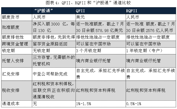 (1)对“沪股通”、QFII和RQFII的通道成本分析以及两类通道特点的对比,显示存量资金可能转移至“沪股通”渠道。现有的外资投资A股的通道主要有RQFII和QFII。从获取额度的便利性和通道费用来说,“沪股通”有着明显的优势。目前香港市场QFII通道的使用费约为每年1%-1.5%,最高时曾经达到过约每年3%;RQFII通道使用费为约每年0.5%-1%;而“沪股通”不存在通道使用费。另外,“沪港通”无需额外的托管机构,而QFII和RQFII需要境内商业银行托管,托管费约为0.125%。费用的比较显示出“沪股通”有着明显的成本优势,投资者有可能调整使用的通道,通过“沪股通”进入A股市场。